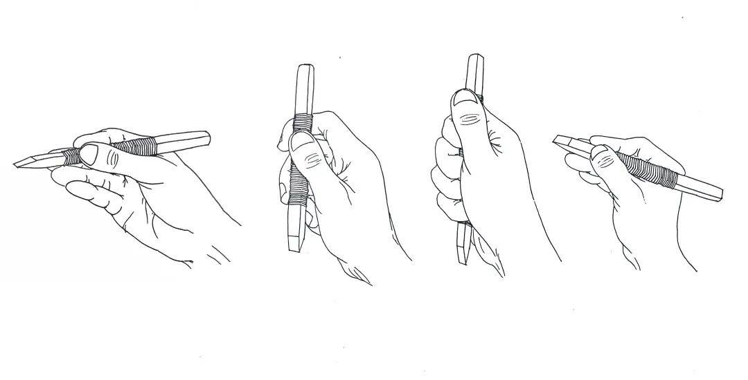 这一点,是在强调每个人要经过大量的书法和篆刻实践能找到自己的“核心发力指”,不必拘泥于第四指、第三指。因为通常情况下,我们的执刀方法亦如写毛笔字执笔一样,无有“定法”。其最终目的在于达成“指力-腕力-臂力-身力-心力”的贯通,而字的大小,笔画的长短、粗细、光毛等,都对用刀的发力方法有不同的要求。