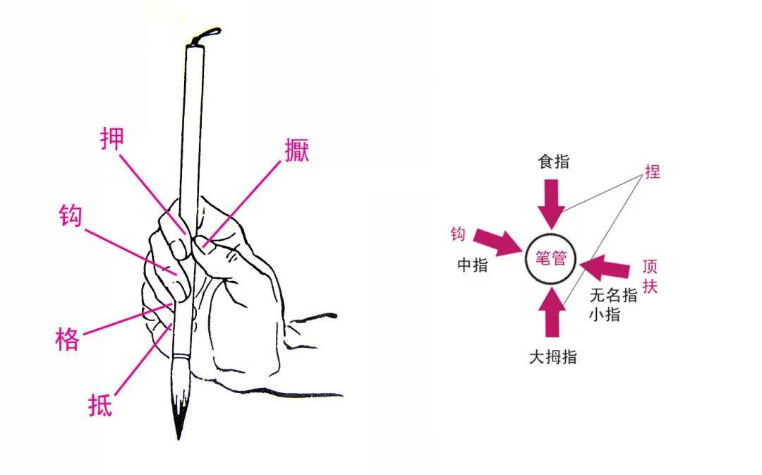 又传“把笔诀”:用拇指和食指相对勾住笔管,手腕悬空提起;运笔时左手(辅助手)侧让,右手(执笔手)主导;掌心要空虚,手指要用力握紧笔管;入笔的时候像穿针引线一样徐缓,出笔的时候要快速发力送出;动笔之前先要在心里构思好字形和笔意,字形会随着运笔自然呈现出来。