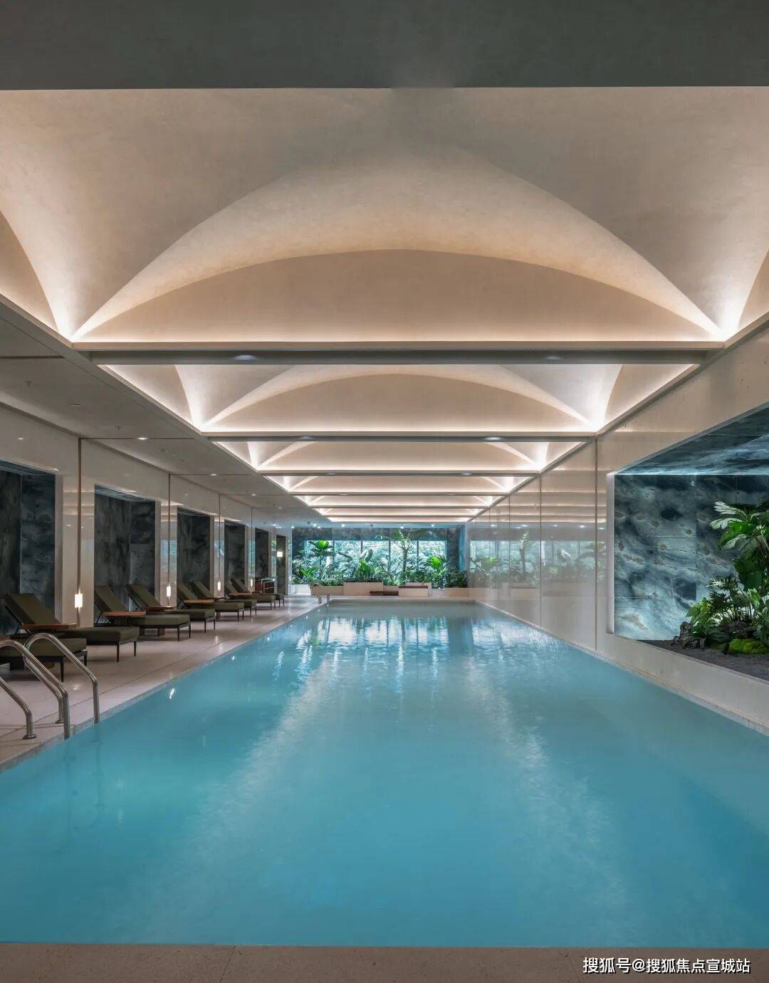 植物园泳池放在了2楼,选用了皮革面的绿色石材,营造一种树影斑驳的感觉。里面的绿植不是装饰,都是鲜活的、精心照养的。