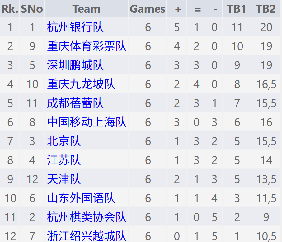 回顾9月1日在南京结束的第一站前六轮的比赛,各参赛队伍激烈比拼,为今年联赛的精彩程度奠定了坚实的基础。六轮过后,杭州银行队五胜一平场分11分暂时领先;重庆体育彩票对四胜两平场分10分,紧随其后;深圳鹏城队三胜三平场分9分排名第三。之后是重庆九龙坡队场分8分,成都蓓蕾队场分7分,中国移动上海队场分6分。北京队、江苏队和天津队场分同积5分,山东外国语队场分3分,杭州棋类协会队场分2分,浙江绍兴越城队场分1分。